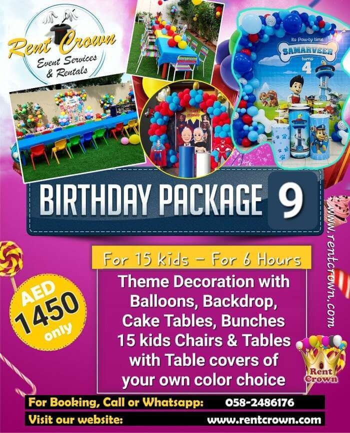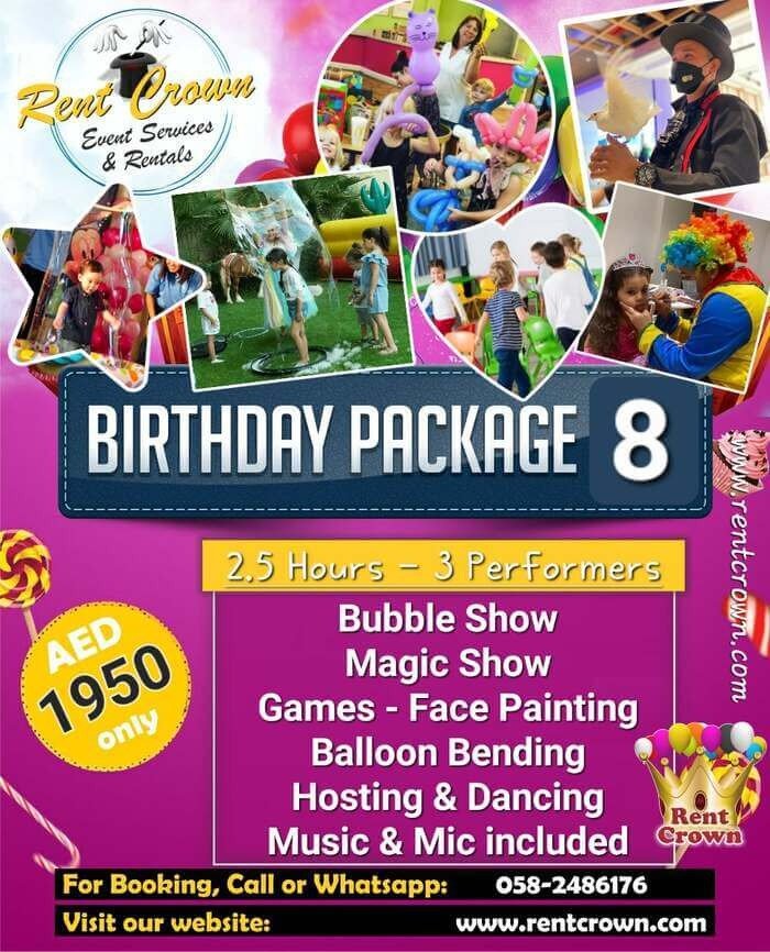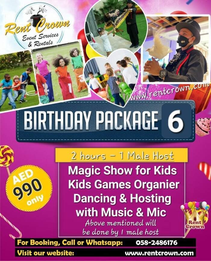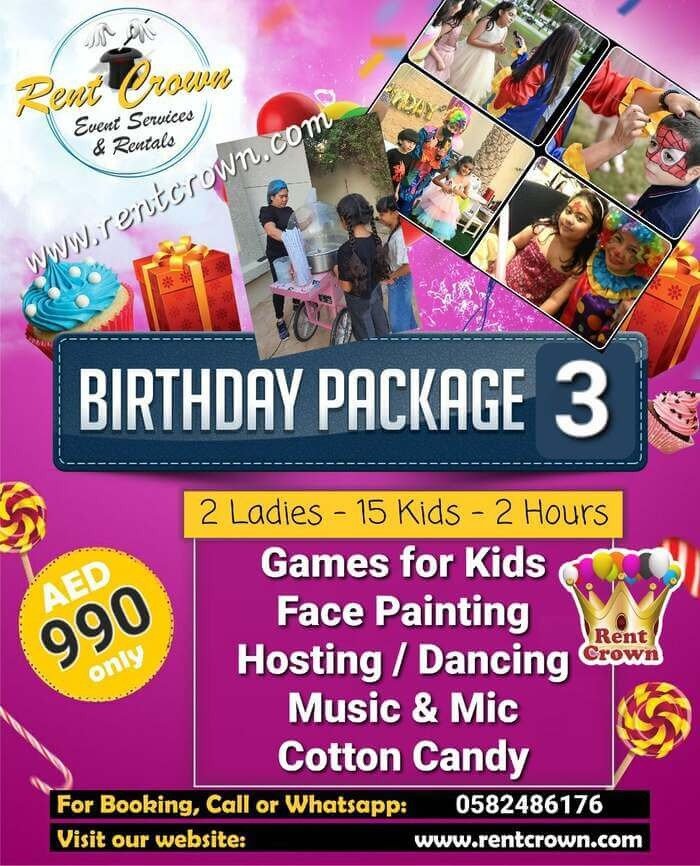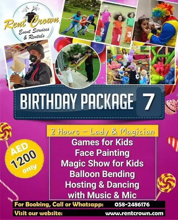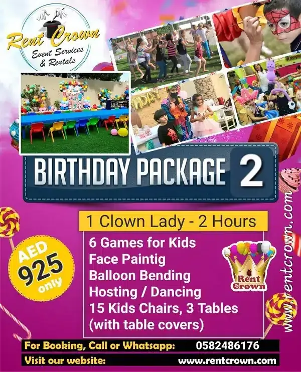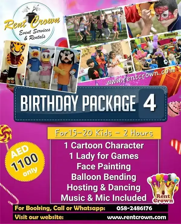 That’s why our birthday party packages in Dubai are designed to take the pressure off your shoulders. We’ve thoughtfully combined the most-loved elements into fixed packages that include theme decoration, a professional birthday hostess, fun games, mascot characters, magic shows, face painting, tables, chairs, and more.
